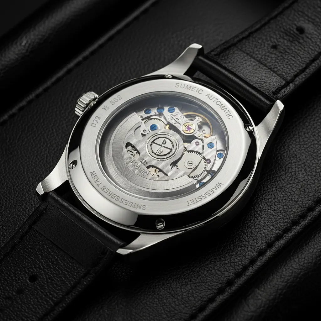 Swiss automatic timepiece with exhibition caseback and refined dial.